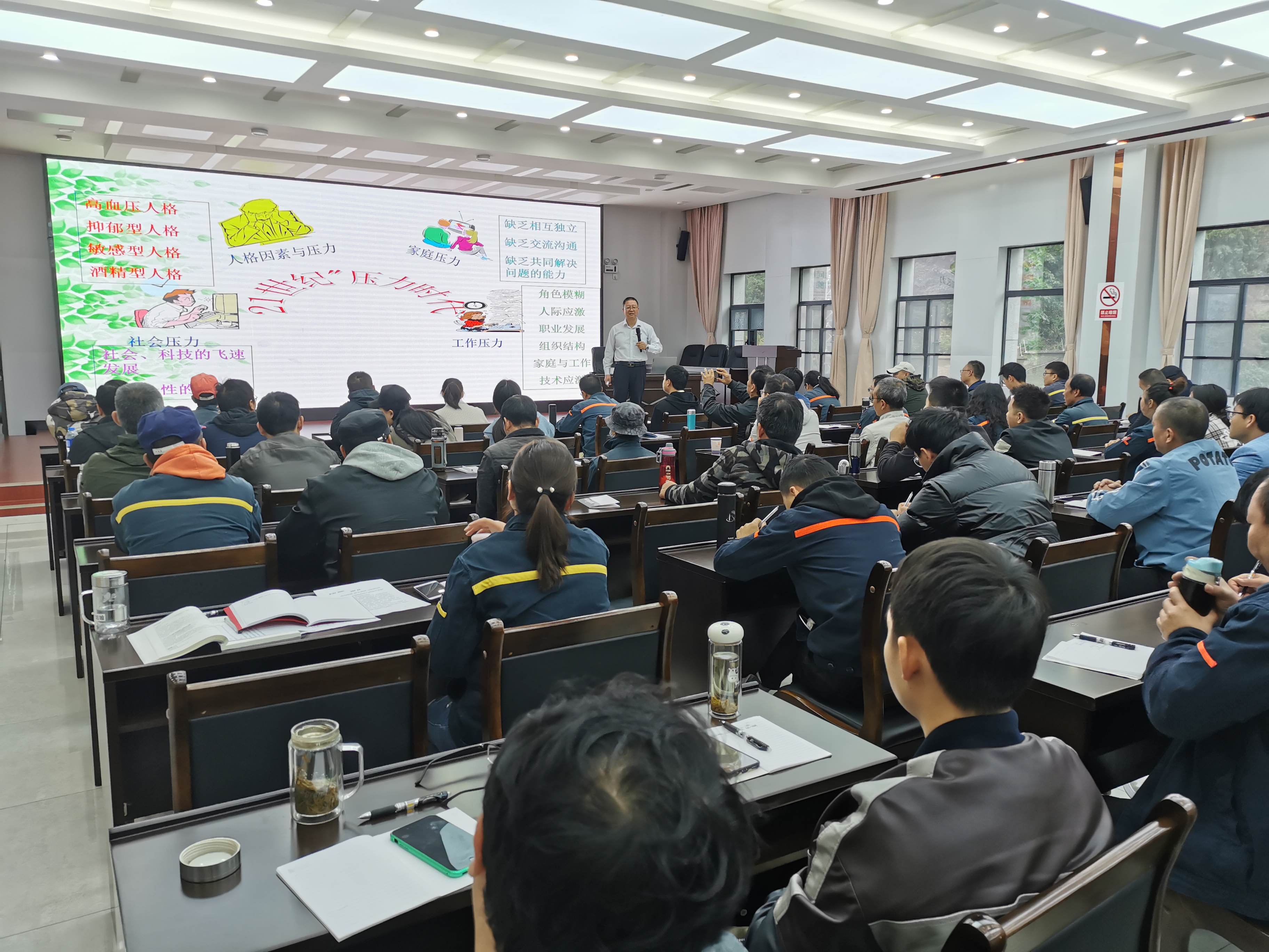 外訓(xùn)主要以關(guān)注職工的心理健康和壓力調(diào)試,特別邀請(qǐng)了國(guó)家二級(jí)心理咨詢師、云南省心理學(xué)會(huì)會(huì)員朱景忠老師,以《快樂(lè)生活 幸福工作》為題,圍繞“認(rèn)識(shí)自己、準(zhǔn)確定位;處理好與環(huán)境的關(guān)系;處理好人與人的關(guān)系;處理好與家庭的關(guān)系”四個(gè)方面,從黨史故事到社會(huì)現(xiàn)狀,從詩(shī)詞歌賦到人生哲理,結(jié)合個(gè)人多年的親身經(jīng)歷和實(shí)踐經(jīng)驗(yàn),用通俗易懂的語(yǔ)言,深入淺出地為廣大職工解決工作和生活中的困惑“送湯送藥”,為職工講述了一堂生動(dòng)有趣的課程。
