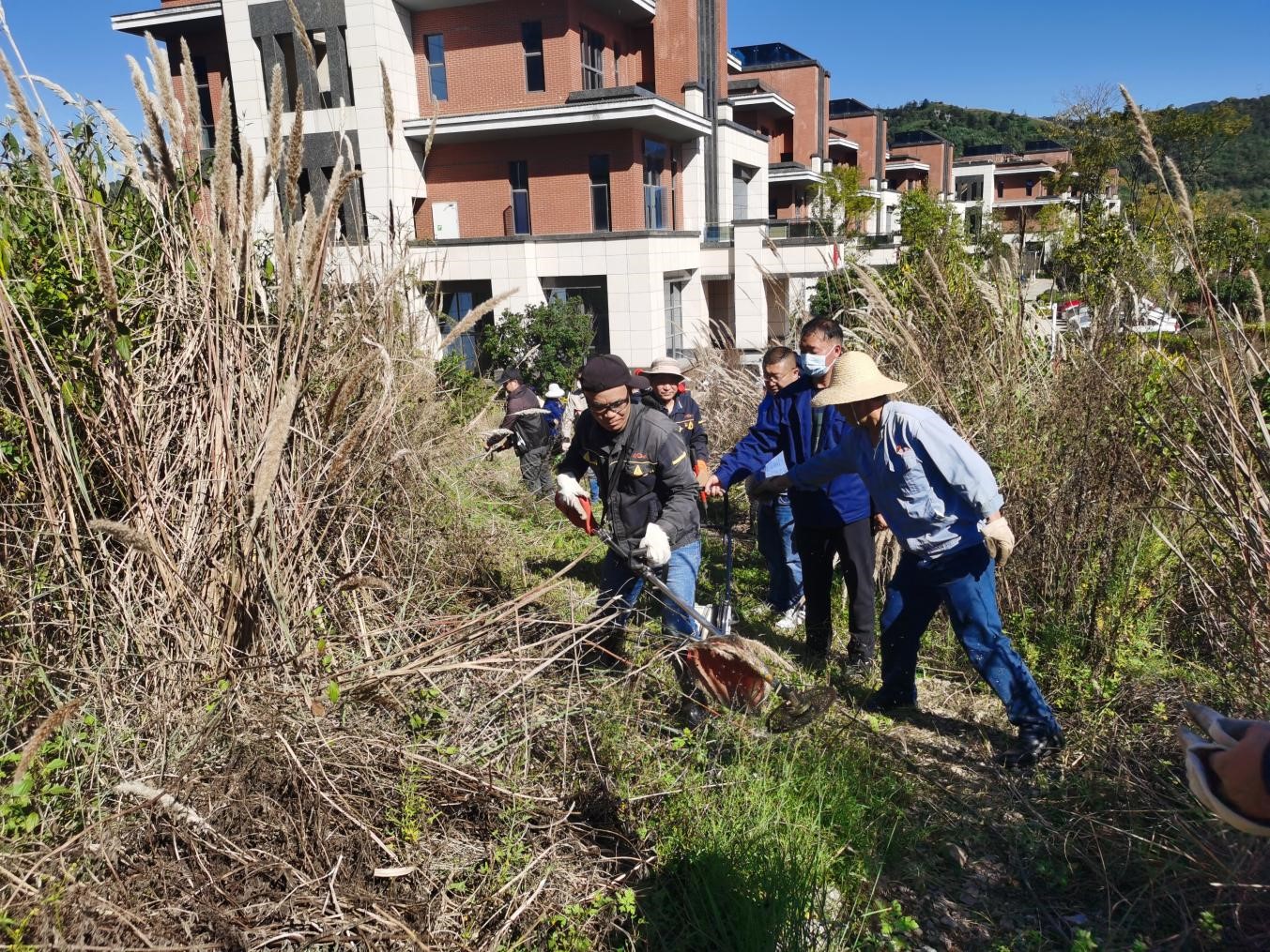 當(dāng)天大家頂著炎炎烈日,戴著手套,拿著工具對(duì)水池周圍一米范圍內(nèi)的灌木、雜草,樹木進(jìn)行修枝清理和清除消防泵房周圍一米范圍內(nèi)雜草。除草區(qū)域分片區(qū)迅速展開除草行動(dòng),有的拿鐮刀割、有的拿鋤頭刨、有的用割草機(jī)割、有的拿砍刀砍,還有的直接用手,全然不顧泥草沾滿了褲腿,大家興致高昂、分工合作、積極配合,充分發(fā)揮了不怕苦、不怕臟、不怕累的勞動(dòng)精神,通過三小時(shí)的清理原本雜草叢生的水池便煥然一新,回望路邊一個(gè)又一個(gè)的草垛,大家都露出了開心的笑容。