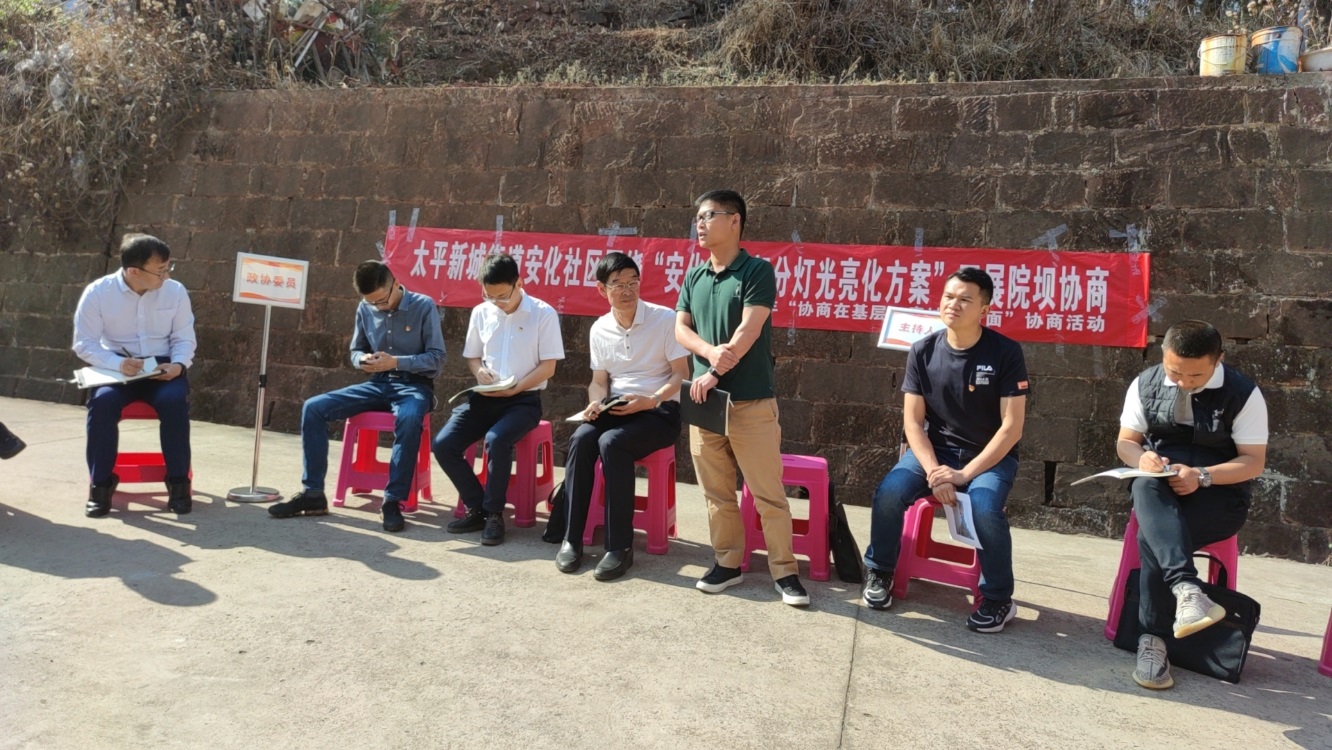 會上,安化社區(qū)負(fù)責(zé)人對路燈安裝方案進(jìn)行了介紹,參會人員各抒己見,對該片區(qū)路燈安裝提出了意見和建議。安化社區(qū)和安化物管公司工作人員對住戶提出的涉及路燈照明的其他問題,做了記錄和解答。在安寧市政協(xié)的調(diào)研指導(dǎo)下,參會人員一致通過路燈安裝方案。