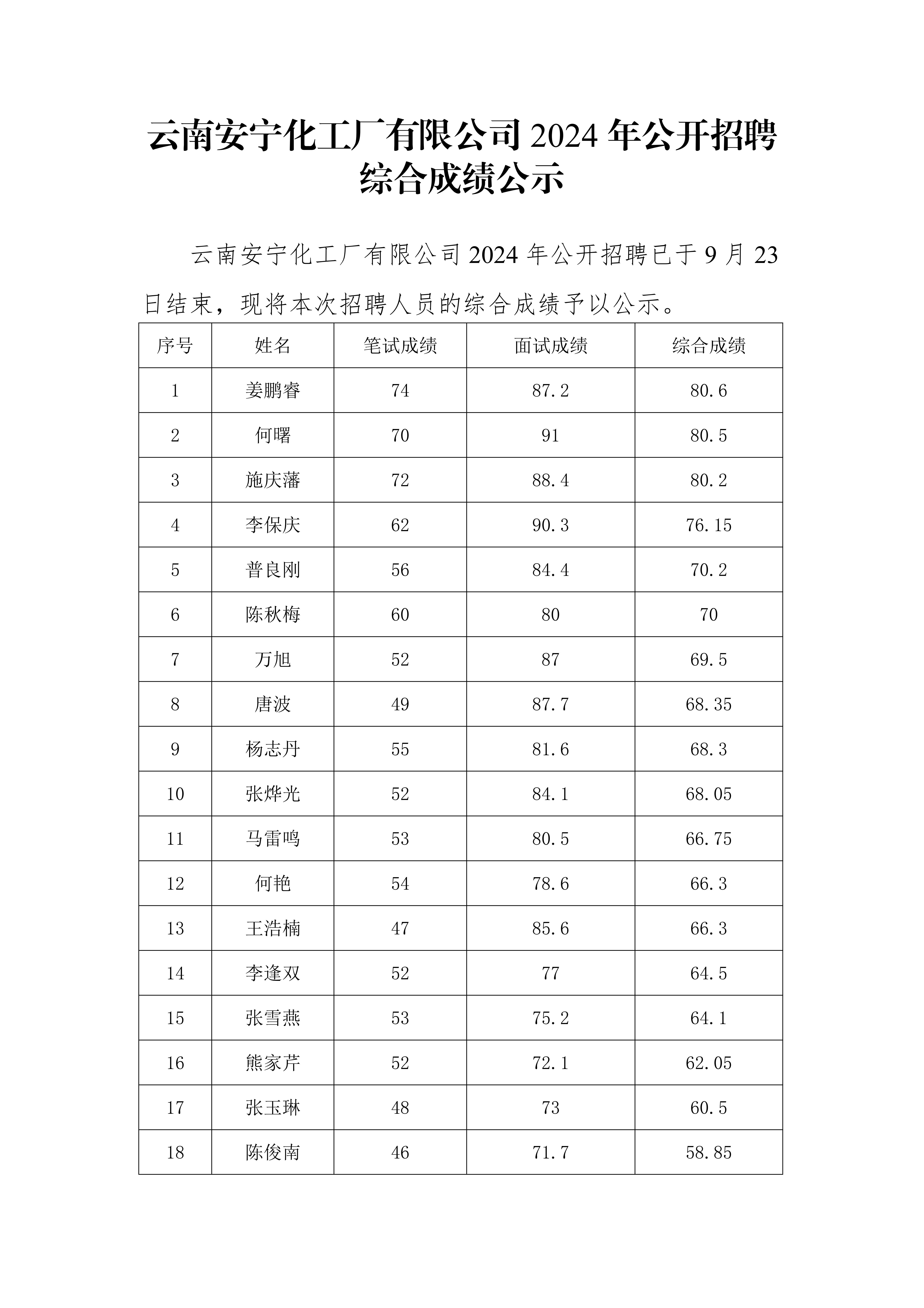 云南安寧化工廠有限公司2024 年公開招聘綜合成績(jī)公示