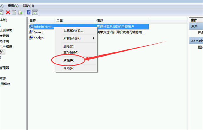 3、在右側(cè)的分組框內(nèi)選中超級管理員用戶(默認(rèn)是Admonistrator,若操作系統(tǒng)使win7以上則選擇你自己設(shè)置的用戶),點擊鼠標(biāo)右鍵,并點擊“屬性”按鈕;