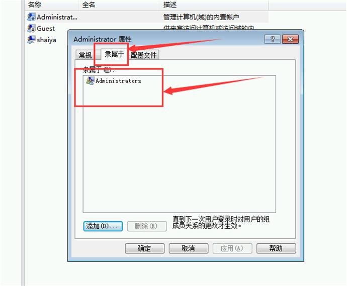 4、在選擇夾中選中“隸屬于”標(biāo)簽,將除administrators外的所有用戶全部刪除;