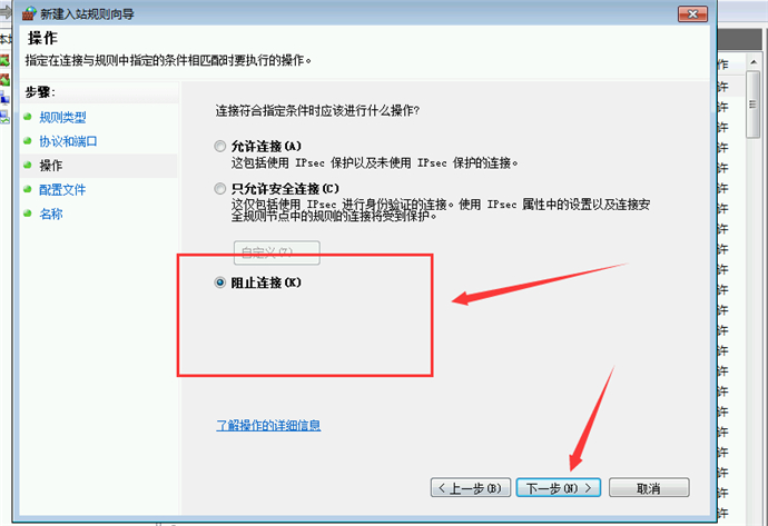 9、選中“阻止鏈接”單選框后,點擊“下一步”
